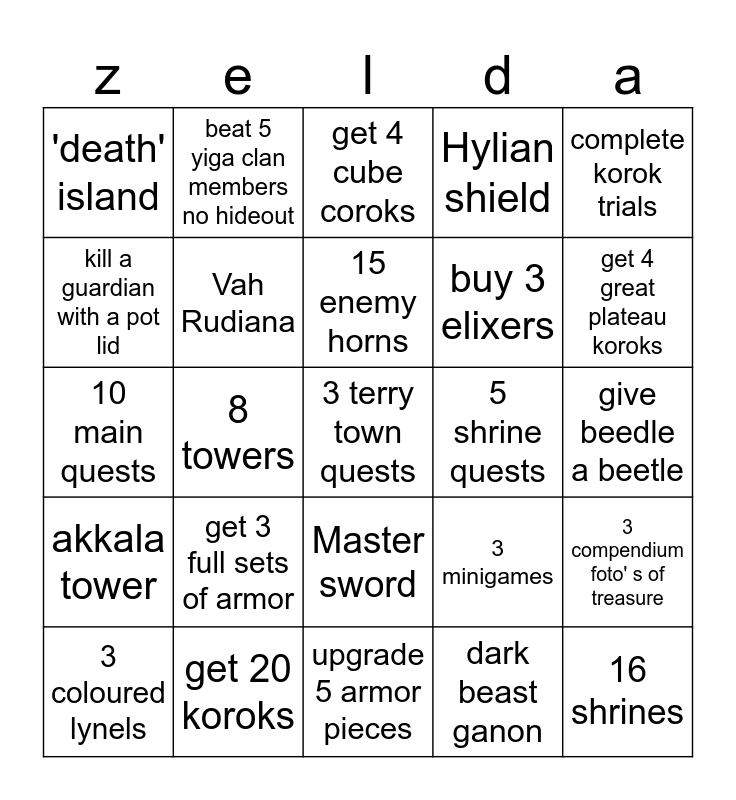 Botw Bingo | Botw Bingo | Totk bingo | ZELDAAA SAH | Breath of the Wild Goal Card