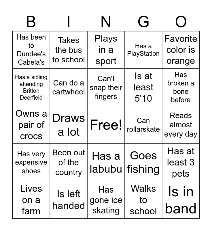 This bingo card has a free space and 24 words: Been out of the country, Is left handed, Can't snap their fingers, Lives on a farm, Favorite color is orange, Has been to Dundee's Cabela's, Has a sibling attending Britton Deerfield, Takes the bus to school, Can rollarskate, Has a labubu, Is at least 5'10, Owns a pair of crocs, Goes fishing, Has at least 3 pets, Can do a cartwheel, Walks to school, Reads almost every day, Plays in a sport, Has broken a bone before, Draws a lot, Is in band, Has very expensive shoes, Has a PlayStation and Has gone ice skating.