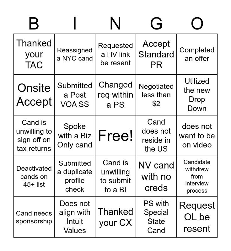 This bingo card has a free space and 32 words: PS with Special State Cand, Submitted a Referral SS, Spoke with a Biz Only cand, Dispoed PS LM4, Deactivated cands on 45+ list, Submitted a Post VOA SS, Completed an offer, Candidate withdrew from interview process, Reassigned a NYC cand, Recommended a candidate to IA via a failed PS, Changed req within a PS, Requested a HV link be resent, Discussed ProDev with a cand, Cand hung up on you, Cand does not reside in the US, Cand does not speak English, Cand needs sponsorship, Cand is unwilling to sign off on tax returns, Cand is unwilling to submit to a BI, Submitted a duplicate profile check, NV cand with no creds, Unable to meet home office requirements, does not want to be on video, Does not align with Intuit Values, Request OL be resent, Accept Standard PR, Negotiated less than $2, Onsite Accept, Thanked your TAC, Thanked your CX, Cand doesnt know what a PTIN is and Utilized the new Drop Down.