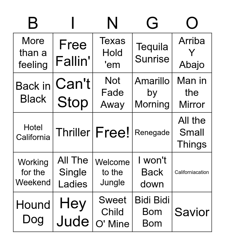 This bingo card has a free space and 24 words: All The Single Ladies, Hey Jude, Not Fade Away, Hound Dog, Arriba Y Abajo, More than a feeling, Back in Black, Free Fallin', Renegade, Welcome to the Jungle, Amarillo by Morning, Hotel California, I won't Back down, Californiacation, Can't Stop, Bidi Bidi Bom Bom, All the Small Things, Texas Hold 'em, Man in the Mirror, Thriller, Savior, Working for the Weekend, Tequila Sunrise and Sweet Child O' Mine.