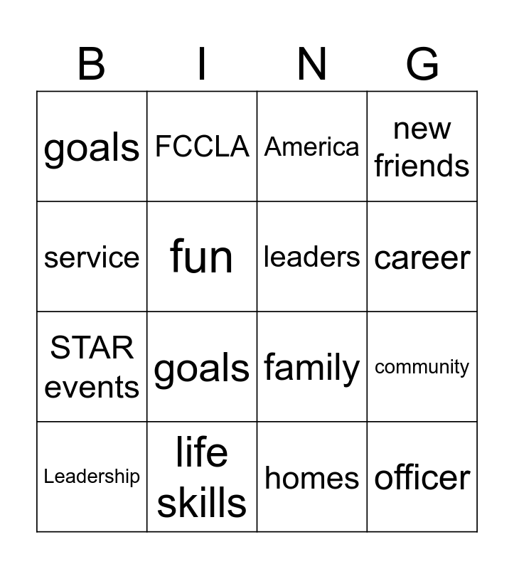 This bingo card has 16 words: life skills, community, America, goals, STAR events, FCCLA, family, homes, service, fun, Leadership, new friends, goals, career, leaders and officer.