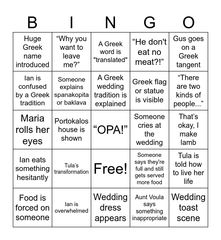 This bingo card has 43 words: “Put some Windex on it”, “OPA!”, Someone mispronounces “Miller”, Food is forced on someone, Greek dancing, Aunt Voula says something inappropriate, A Greek word is "translated", Baklava is shown or eaten, Gus goes on a Greek tangent, Ian is overwhelmed, “He don't eat no meat?!”, Someone cries at the wedding, Free!, Tula’s transformation, Greek church scene, Wedding dress appears, A weird wedding gift, Maria rolls her eyes, Family invades Ian's space, “There are two kinds of people...”, “Why you want to leave me?”, Someone gets makeover advice, Lamb is mentioned, Huge Greek name introduced, My name is Ian Miller, That’s okay, I make lamb, Let me tell you the root of that word…, You better get married soon. You're starting to look... old!, Someone says they're full and still gets served more food, Ian eats something hesitantly, A cousin appears unexpectedly, Tula is told how to live her life, Ian’s parents are visibly uncomfortable, Portokalos house is shown, Someone complains about the wedding, Pre-wedding chaos, Wedding toast scene, A Greek wedding tradition is explained, Ian is confused by a Greek tradition, Greek flag or statue is visible, Someone says “It's a Greek tradition!”, Someone explains spanakopita or baklava and Someone compares Greek and American culture.