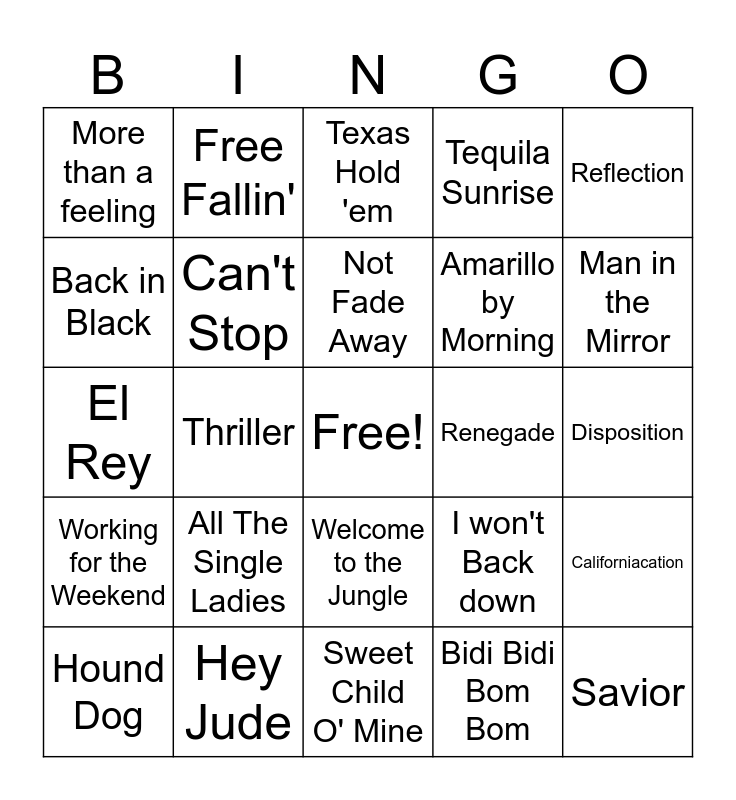 This bingo card has a free space and 24 words: All The Single Ladies, Hey Jude, Not Fade Away, Hound Dog, Reflection, More than a feeling, Back in Black, Free Fallin', Renegade, Welcome to the Jungle, Amarillo by Morning, El Rey, I won't Back down, Californiacation, Can't Stop, Bidi Bidi Bom Bom, Disposition, Texas Hold 'em, Man in the Mirror, Thriller, Savior, Working for the Weekend, Tequila Sunrise and Sweet Child O' Mine.