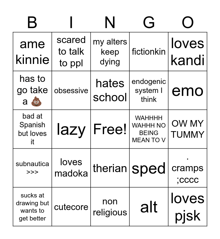 This bingo card has a free space and 24 words: loves madoka, cutecore, hates school, sucks at drawing but wants to get better, loves kandi, ame kinnie, has to go take a 💩, scared to talk to ppl, WAHHHH WAHHH NO BEING MEAN TO V, therian, endogenic system I think, bad at Spanish but loves it, sped, . cramps ;cccc, obsessive, alt, OW MY TUMMY, my alters keep dying, emo, lazy, loves pjsk, subnautica >>>, fictionkin and non religious.