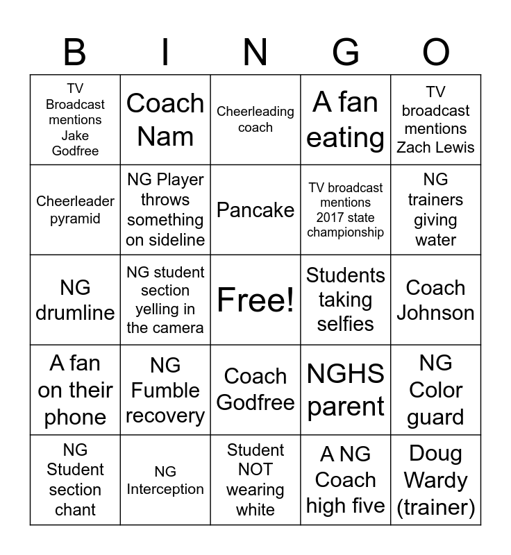 This bingo card has a free space and 26 words: Coach Godfree, A NG Coach high five, Pancake, NG Interception, TV broadcast mentions Zach Lewis, TV Broadcast mentions Jake Godfree, Cheerleader pyramid, Coach Nam, Coach Johnson, NGHS parent, TV broadcast mentions 2017 state championship, NG drumline, NG Color guard, NG Student section chant, NG student section yelling in the camera, Painted NG student, A fan eating, A fan on their phone, Cheerleading coach, Doug Wardy (trainer), NG trainers giving water, Student NOT wearing white, Students taking selfies, NG Fumble recovery, NG Player throws something on sideline and Live mascot.