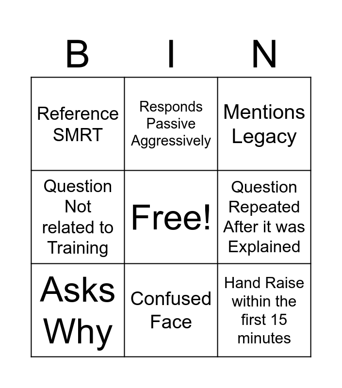 This bingo card has a free space and 8 words: Question Repeated After it was Explained, Mentions Legacy, Responds Passive Aggressively, Asks Why, Reference SMRT, Hand Raise within the first 15 minutes, Question Not related to Training and Confused Face.