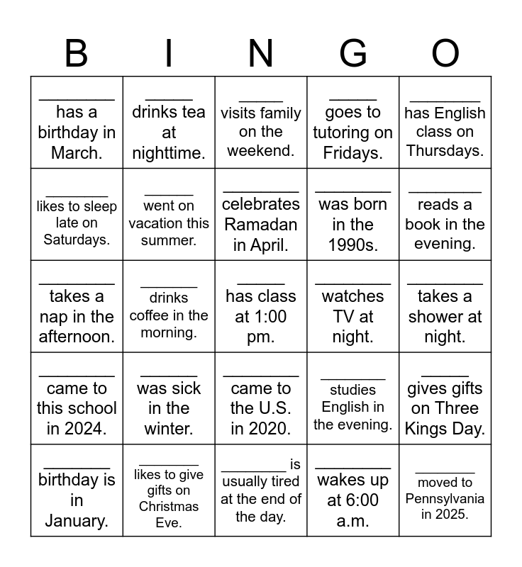 This bingo card has a free space and 29 words: _______ birthday is in January., _______ works at night., _______ drinks coffee in the morning., ______ celebrates with friends on holidays., ________ has a birthday in March., _____ visits family on the weekend., ______ went on vacation this summer., ______ was sick in the winter., ________ watches TV at night., ________ likes to give gifts on Christmas Eve., ________ takes a shower at night., ________ moved to Pennsylvania in 2025., ________ is usually tired at the end of the day., ________ wakes up at 6:00 a.m., ________ reads a book in the evening., ________ works on Monday mornings., ________ came to the U.S. in 2020., ________ came to this school in 2024., ________ has English class on Thursdays., ________ takes a nap in the afternoon., ________ studies English in the evening., ________ was born in the summer., ________ was born in the 1990s., ________ likes to sleep late on Saturdays., _____ goes to tutoring on Fridays., _____ drinks tea at nighttime., _____ gives gifts on Three Kings Day., ________ celebrates Ramadan in April. and ________ goes to the temple on special Hindu holidays..