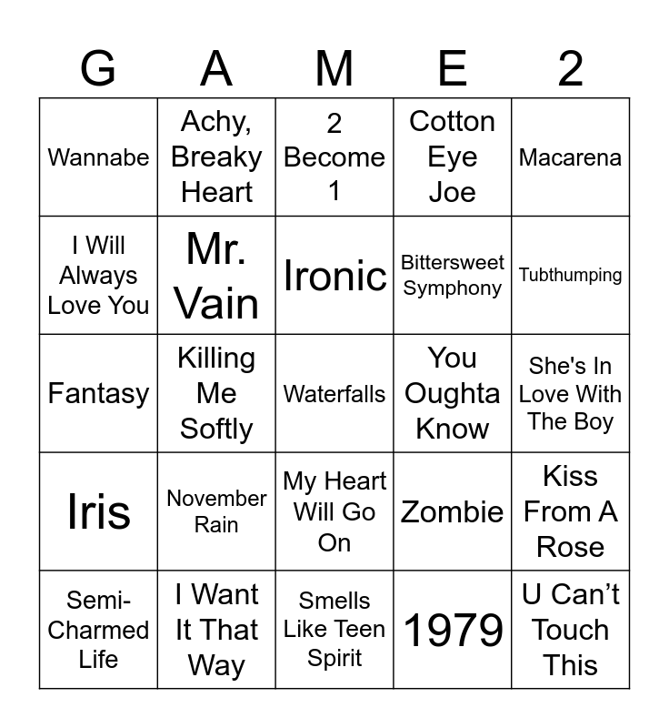This bingo card has a free space and 49 words: Vogue, U Can’t Touch This, Ice Ice Baby, Smells Like Teen Spirit, November Rain, Under The Bridge, Achy, Breaky Heart, Jump Around, I Will Always Love You, What Is Love, Mr. Vain, Cotton Eye Joe, Kiss From A Rose, Zombie, Breakfast At Tiffany's, Wonderwall, Ironic, You Oughta Know, Don't Speak, Macarena, Killing Me Softly, 1979, Wannabe, Bittersweet Symphony, MMMBop, Tubthumping, Semi-Charmed Life, Torn, My Heart Will Go On, Iris, Baby One More Time, All Star, Smooth, Genie In A Bottle, I Want It That Way, Larger Than Life, Blue (Da Ba Dee), No Scrubs, She's In Love With The Boy, Losing My Religion, Creep, Black Hole Sun, Shoop, Gangstas Paradise, Fantasy, 2 Become 1, Ray Of Light, Miami and Breathe.