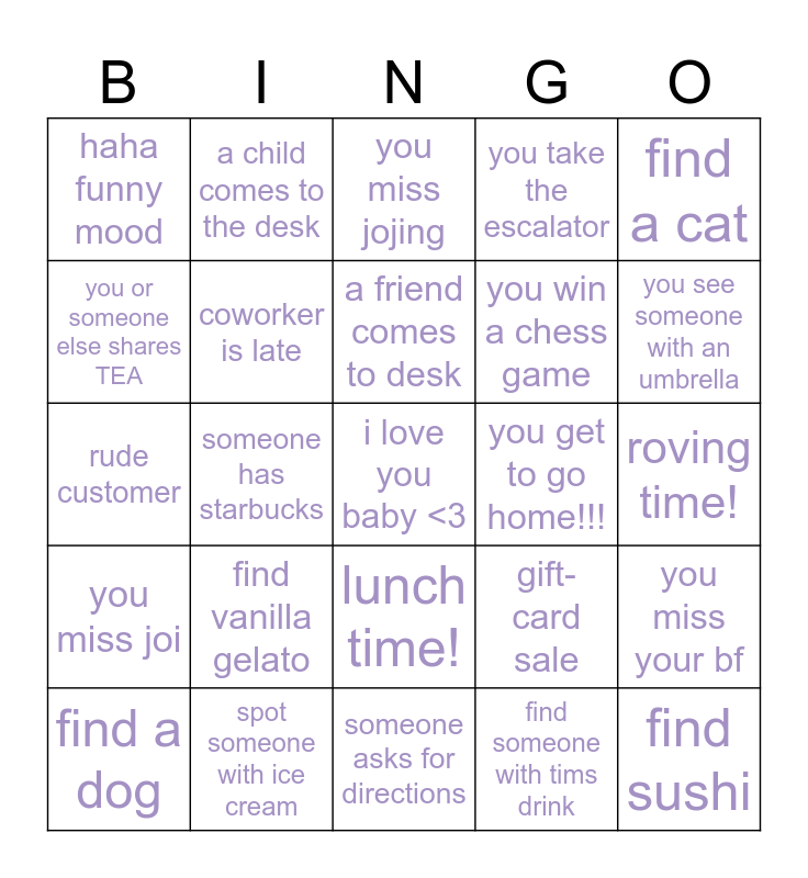 This bingo card has a free space and 24 words: find vanilla gelato, spot someone with ice cream, a friend comes to desk, find a dog, find a cat, haha funny mood, you or someone else shares TEA, a child comes to the desk, you get to go home!!!, lunch time!, you win a chess game, rude customer, gift-card sale, you miss your bf, coworker is late, find someone with tims drink, roving time!, you miss jojing, you see someone with an umbrella, someone has starbucks, find sushi, you miss joi, you take the escalator and someone asks for directions.