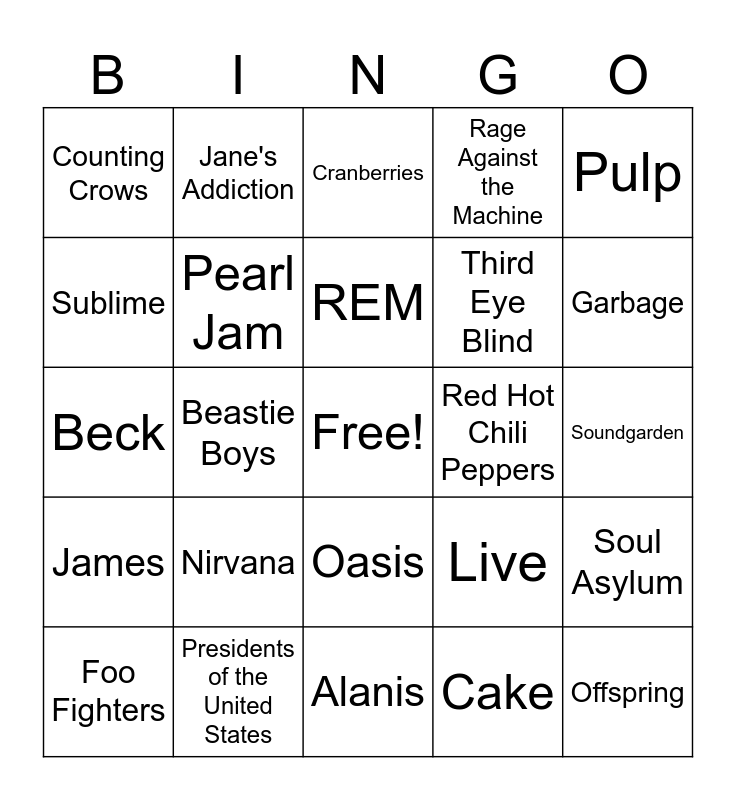 This bingo card has a free space and 39 words: U2, Def Leppard, Alice in Chains, Pearl Jam, Foo Fighters, Oasis, REM, Smashinig Pumpkins, Pulp, James, Beastie Boys, Rage Against the Machine, Offspring, Soundgarden, Red Hot Chili Peppers, Nirvana, Stone Temple Pilots, Counting Crows, Gin Blossoms, Live, Sublime, Alanis, Third Eye Blind, Garbage, No Doubt, Hole, Collective Soul, Weezer, Bush, Jane's Addiction, Nine Inch Nails, Everclear, Cranberries, Presidents of the United States, Cake, Radiohead, Soul Asylum, Beck and Lemonheads.