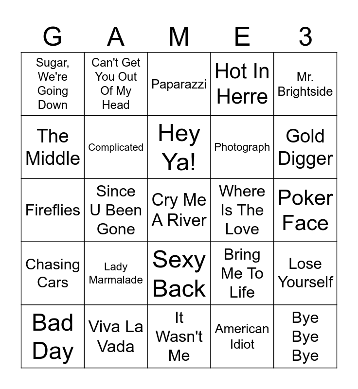 This bingo card has a free space and 49 words: Oops!...I Did It Again, Bye Bye Bye, Kryptonite, It Wasn't Me, Lady Marmalade, Survivor, Can't Get You Out Of My Head, Drops Of Jupiter, The Middle, Family Affair, Complicated, Hot In Herre, Lose Yourself, Bring Me To Life, Crazy In Love, In Da Club, Hey Ya!, Where Is The Love, Hollaback Girl, Mr. Brightside, Since U Been Gone, American Idiot, Sugar, We're Going Down, Photograph, Behind These Hazel Eyes, Gold Digger, Bad Day, Hips Don't Lie, Sexy Back, Chasing Cars, Girlfriend, Apologize, Bleeding Love, Stronger, Viva La Vada, Love Story, Single Ladies, Just Dance, Poker Face, I Gotta Feeling, Use Somebody, Halo, Empire State Of Mind, You Belong With Me, Fireflies, Paparazzi, Tik Tok, Boom Boom Pow and Meet Me Halfway.