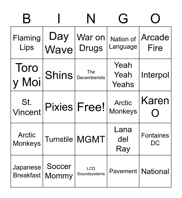 This bingo card has a free space and 44 words: Bon Iver, National, Wet Leg, Japanese Breakfast, Spoon, Pavement, War on Drugs, The Last Dinner Party, Arcade Fire, Soccer Mommy, Nation of Language, Arctic Monkeys, MGMT, Turnstile, Radiohead, LCD Soundsystems, Modest Mouse, St. Vincent, The Strokes, Interpol, Day Wave, Sudan Archives, Tame Impala, Flaming Lips, Sea Lemon, Karen O, Mitski, Vampire Weekend, Lana del Ray, Arctic Monkeys, Big Thief, Fontaines DC, Fontaines DC, Magnetic Fields, Pixies, Death Cab, Alvvays, Phoenix, The Decemberists, Toro y Moi, Yeah Yeah Yeahs, Car Seat Headrest, Shins and Father John Misty.