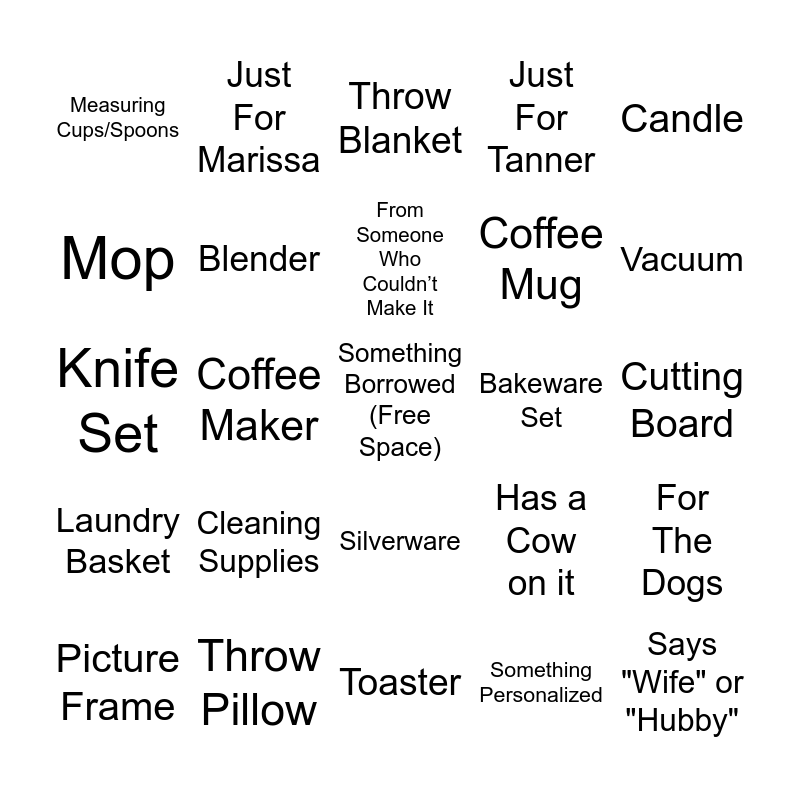 This bingo card has a free space and 29 words: Picture Frame, Gift Card, Coffee Maker, Towels, Measuring Cups/Spoons, Throw Blanket, Blender, Cleaning Supplies, Bakeware Set, Throw Pillow, Cutting Board, Says "Wife" or "Hubby", Toaster, Something Personalized, Vacuum, Bed Sheets, Silverware, Laundry Basket, Candle, Knife Set, Has a Cow on it, Laundry Supplies, Coffee Mug, Mop, Just For Tanner, Just For Marissa, For The Dogs, From Someone Who Couldn’t Make It and BIG Gift.