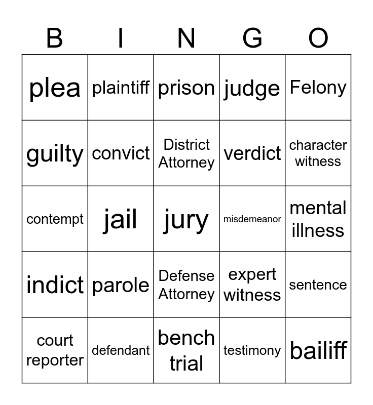 This bingo card has 40 words: Acquit, contempt, competency, convict, defendant, Defense Attorney, District Attorney, Evidence, Felony, indict, jail, judge, jury, mental illness, misdemeanor, parole, perjury, plea, plea bargain, prison, sentence, testimony, verdict, guilty, not guilty, no contest, NGI, Chapter 51, bailiff, bail, charges, court reporter, eye witness, expert witness, character witness, bench trial, rights, appeal, plaintiff and trial.