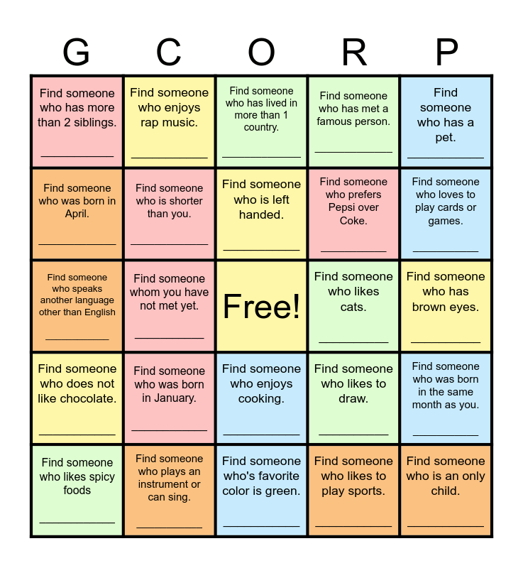 This bingo card has a free space and 24 words: Find someone who was born in January. ____________, Find someone who plays an instrument or can sing. ___________, Find someone who is left handed. ___________, Find someone who likes spicy foods ____________, Find someone who has a pet. ___________, Find someone who has more than 2 siblings. ___________, Find someone who was born in April. _____________, Find someone who enjoys rap music. ___________, Find someone who likes cats. __________, Find someone who enjoys cooking. ___________, Find someone who prefers Pepsi over Coke. ___________, Find someone who speaks another language other than English ____________, Find someone who likes to draw. __________, Find someone who was born in the same month as you. ___________, Find someone who is shorter than you. _____________, Find someone who likes to play sports. ___________, Find someone who has brown eyes. __________, Find someone who has lived in more than 1 country. ______________, Find someone who loves to play cards or games. ___________, Find someone whom you have not met yet. ___________, Find someone who is an only child. ___________, Find someone who does not like chocolate. ___________, Find someone who has met a famous person. _____________ and Find someone who's favorite color is green. ___________.