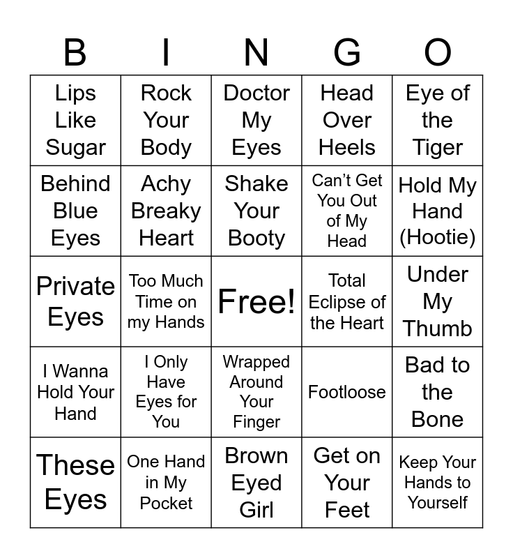 This bingo card has a free space and 54 words: Hips Don’t Lie, I Wanna Hold Your Hand, Died in Your Arms Tonight, Legs, Wrapped Around Your Finger, Hand Clap, Head Over Heels, Left Hand Free, Behind Blue Eyes, Drink in My Hand, Lips Like Sugar, Hands to Myself, One Hand in My Pocket, These Eyes, Private Eyes, Brown Eyed Girl, Keep Your Hands to Yourself, Can’t Get You Out of My Head, Poker Face, Under My Thumb, Footloose, Heart of Glass, Total Eclipse of the Heart, Eye of the Tiger, Lips Are Movin, Rock Your Body, Body Talks, Back in My Arms Again, Can’t Feel My Face, Get on Your Feet, Groove is in the Heart, Head Games, Iris, Body Like a Back Road, Doctor My Eyes, Let Me Clear My Throat, Private Eyes, Bad to the Bone, Cold Heart, Achy Breaky Heart, Tell it to My Heart, Don’t Go Breaking My Heart, Two of Hearts, Can’t Take My Eyes Off of You, I Only Have Eyes for You, Ain’t That a Kick in the Head, My Head My Heart, Move Your Feet, Shake Your Booty, Too Much Time on my Hands, Hold My Hand (Hootie), Born to Hand Jive, Smiley Faces and Open Arms.