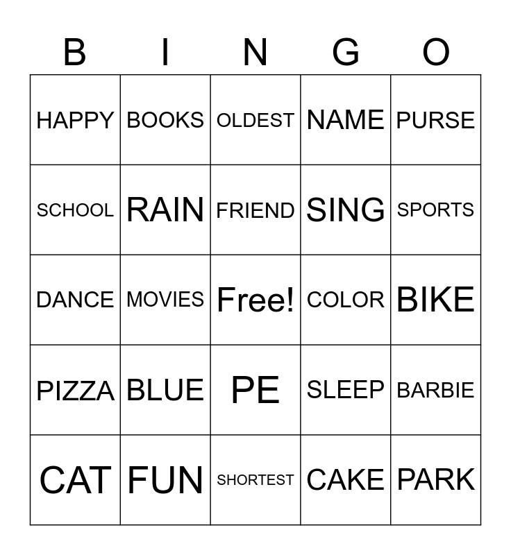 This bingo card has a free space and 24 words: BLUE, FUN, FRIEND, CAT, PURSE, HAPPY, SCHOOL, BOOKS, COLOR, PE, SING, DANCE, SLEEP, BARBIE, RAIN, CAKE, BIKE, OLDEST, SPORTS, MOVIES, PARK, PIZZA, NAME and SHORTEST.