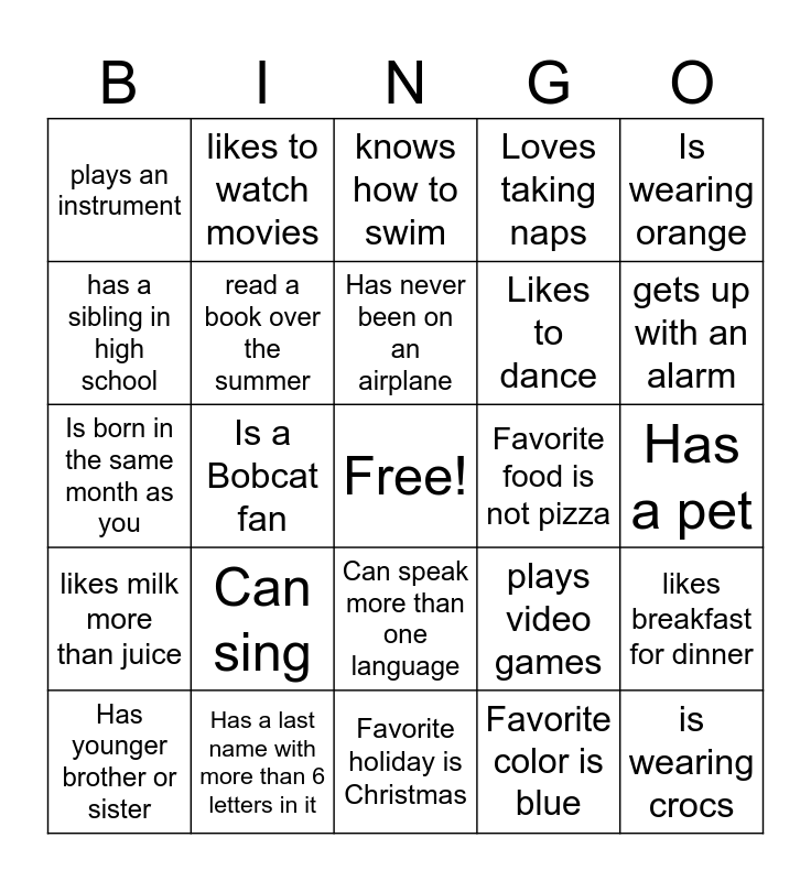 This bingo card has a free space and 24 words: Has younger brother or sister, Can sing, Has never been on an airplane, Favorite color is blue, Is wearing orange, plays an instrument, likes to watch movies, knows how to swim, Favorite food is not pizza, Has a pet, Is born in the same month as you, read a book over the summer, plays video games, likes breakfast for dinner, has a sibling in high school, Has a last name with more than 6 letters in it, Favorite holiday is Christmas, Loves taking naps, gets up with an alarm, likes milk more than juice, Is a Bobcat fan, Can speak more than one language, Likes to dance and is wearing crocs.