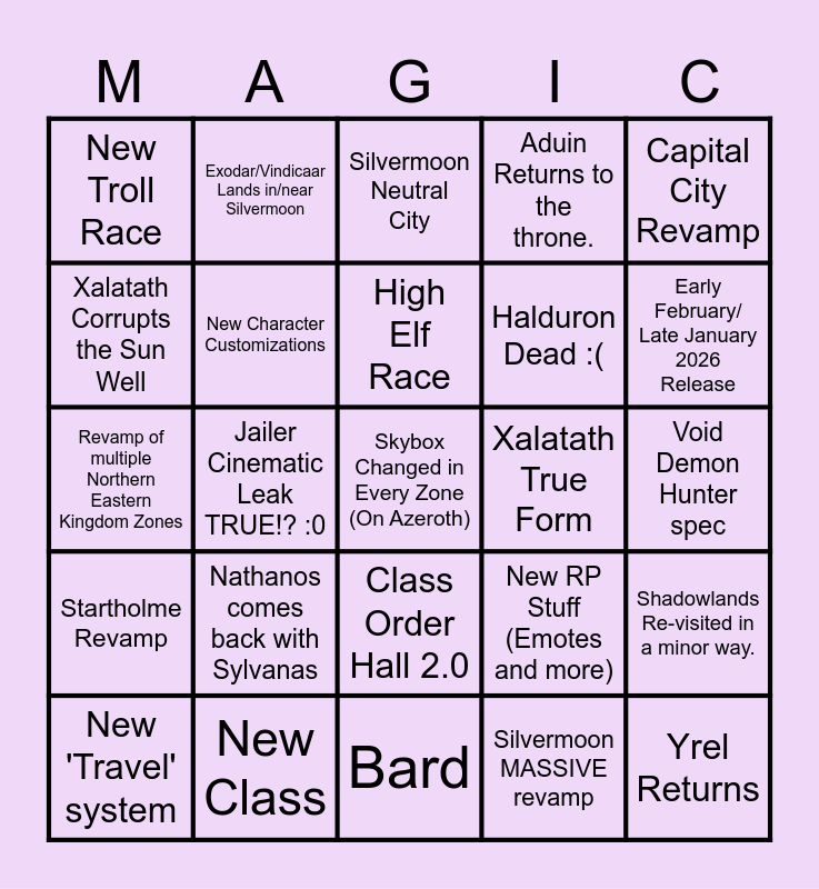 This bingo card has a free space and 24 words: Nathanos comes back with Sylvanas, New Class, High Elf Race, New 'Travel' system, Capital City Revamp, New Troll Race, Xalatath Corrupts the Sun Well, Exodar/Vindicaar Lands in/near Silvermoon, Xalatath True Form, Class Order Hall 2.0, Halduron Dead :(, Revamp of multiple Northern Eastern Kingdom Zones, New RP Stuff (Emotes and more), Shadowlands Re-visited in a minor way., New Character Customizations, Silvermoon MASSIVE revamp, Void Demon Hunter spec, Silvermoon Neutral City, Early February/ Late January 2026 Release, Jailer Cinematic Leak TRUE!? :0, Yrel Returns, Startholme Revamp, Aduin Returns to the throne. and Bard.