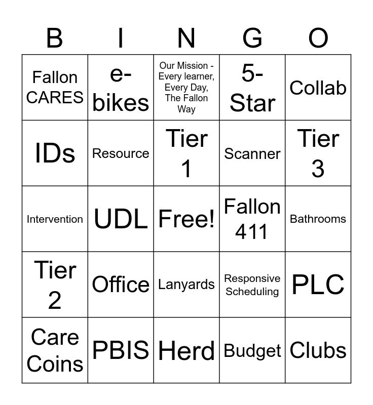 This bingo card has a free space and 24 words: Office, PBIS, Tier 1, Care Coins, Collab, Fallon CARES, IDs, e-bikes, Fallon 411, Lanyards, Scanner, Intervention, Responsive Scheduling, PLC, Resource, Budget, Bathrooms, Our Mission - Every learner, Every Day, The Fallon Way, Tier 3, UDL, Clubs, Tier 2, 5-Star and Herd.
