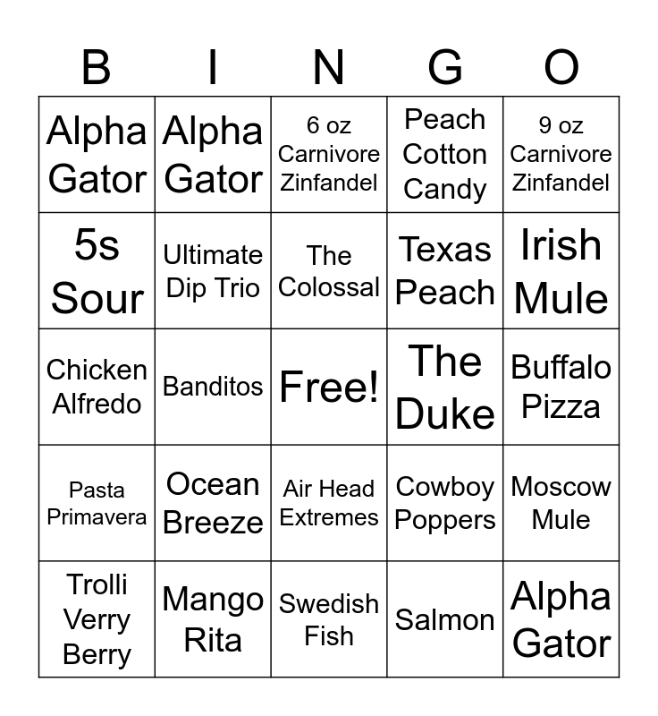 This bingo card has a free space and 29 words: Trolli Verry Berry, Snickers, Banditos, Pink Cadillac, Alpha Gator, 6 oz Carnivore Zinfandel, Ultimate Dip Trio, Ocean Breeze, The Duke, Mango Rita, Buffalo Pizza, Alpha Gator, Swedish Fish, Salmon, Irish Mule, Ribeye ANY Size, Air Head Extremes, Pasta Primavera, 9 oz Carnivore Zinfandel, Chicken Alfredo, Cowboy Poppers, Lemon Pepper Wings, Texas Peach, 5s Sour, Peach Cotton Candy, Alpha Gator, Moscow Mule, The Colossal and Chipotle Burger.