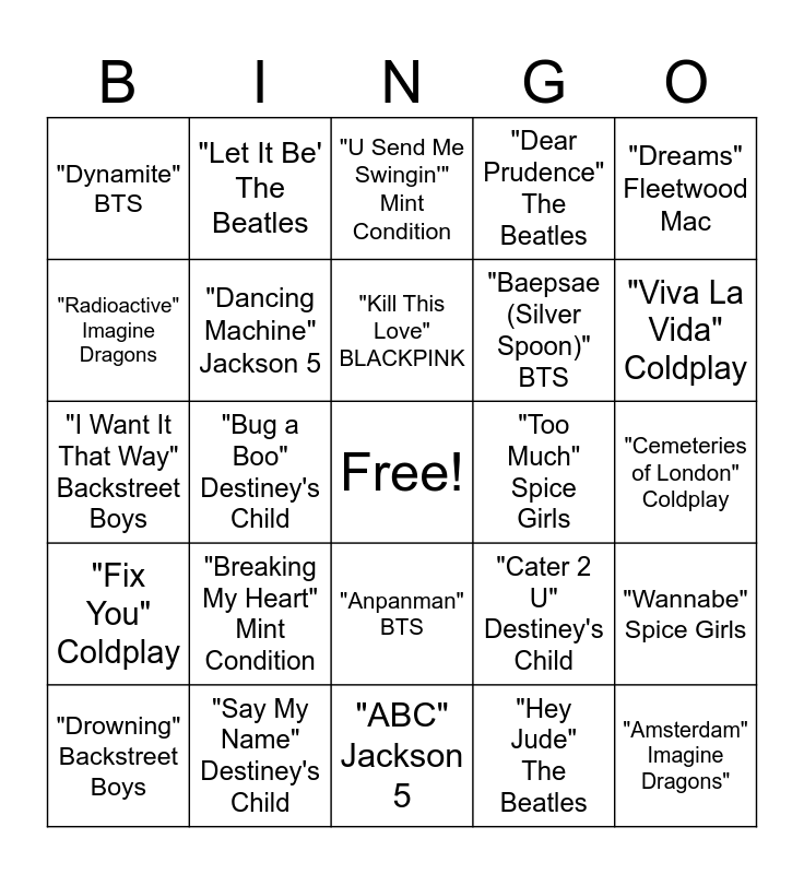 This bingo card has a free space and 24 words: "Breaking My Heart" Mint Condition, "Say My Name" Destiney's Child, "Kill This Love" BLACKPINK, "Drowning" Backstreet Boys, "Dreams" Fleetwood Mac, "Dynamite" BTS, "Radioactive" Imagine Dragons, "Let It Be' The Beatles, "Too Much" Spice Girls, "Anpanman" BTS, "Baepsae (Silver Spoon)" BTS, "I Want It That Way" Backstreet Boys, "Cater 2 U" Destiney's Child, "Wannabe" Spice Girls, "Dancing Machine" Jackson 5, "Hey Jude" The Beatles, "Cemeteries of London" Coldplay, "U Send Me Swingin'" Mint Condition, "Viva La Vida" Coldplay, "Bug a Boo" Destiney's Child, "Amsterdam" Imagine Dragons", "Fix You" Coldplay, "Dear Prudence" The Beatles and "ABC" Jackson 5.