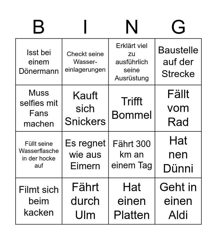 This bingo card has 16 words: Fährt durch Ulm, Hat nen Dünni, Erklärt viel zu ausführlich seine Ausrüstung, Isst bei einem Dönermann, Füllt seine Wasserflasche in der hocke auf, Checkt seine Wasser-einlagerungen, Fährt 300 km an einem Tag, Hat einen Platten, Muss selfies mit Fans machen, Kauft sich Snickers, Filmt sich beim kacken, Baustelle auf der Strecke, Es regnet wie aus Eimern, Fällt vom Rad, Trifft Bommel and Geht in einen Aldi.
