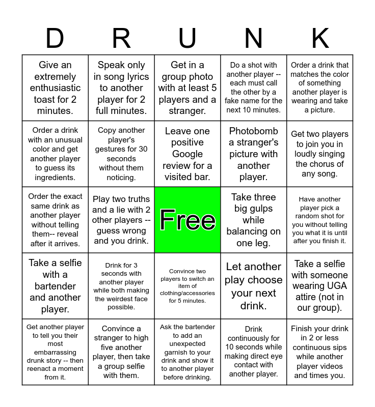 This bingo card has a free space and 24 words: Drink for 3 seconds with another player while both making the weirdest face possible., Convince a stranger to high five another player, then take a group selfie with them., Leave one positive Google review for a visited bar., Get another player to tell you their most embarrassing drunk story -- then reenact a moment from it., Order a drink that matches the color of something another player is wearing and take a picture., Give an extremely enthusiastic toast for 2 minutes., Order a drink with an unusual color and get another player to guess its ingredients., Speak only in song lyrics to another player for 2 full minutes., Take three big gulps while balancing on one leg., Convince two players to switch an item of clothing/accessories for 5 minutes., Photobomb a stranger's picture with another player., Order the exact same drink as another player without telling them-- reveal after it arrives., Let another play choose your next drink., Take a selfie with someone wearing UGA attire (not in our group)., Copy another player's gestures for 30 seconds without them noticing., Drink continuously for 10 seconds while making direct eye contact with another player., Have another player pick a random shot for you without telling you what it is until after you finish it., Get in a group photo with at least 5 players and a stranger., Get two players to join you in loudly singing the chorus of any song., Play two truths and a lie with 2 other players -- guess wrong and you drink., Finish your drink in 2 or less continuous sips while another player videos and times you., Take a selfie with a bartender and another player., Do a shot with another player -- each must call the other by a fake name for the next 10 minutes. and Ask the bartender to add an unexpected garnish to your drink and show it to another player before drinking..
