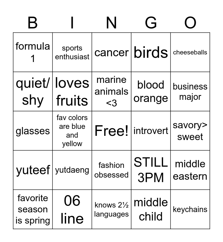 This bingo card has a free space and 24 words: yutdaeng, 06 line, marine animals <3, favorite season is spring, cheeseballs, formula 1, quiet/ shy, sports enthusiast, introvert, fashion obsessed, blood orange, glasses, STILL 3PM, middle eastern, loves fruits, middle child, savory> sweet, cancer, business major, fav colors are blue and yellow, keychains, yuteef, birds and knows 2½ languages.