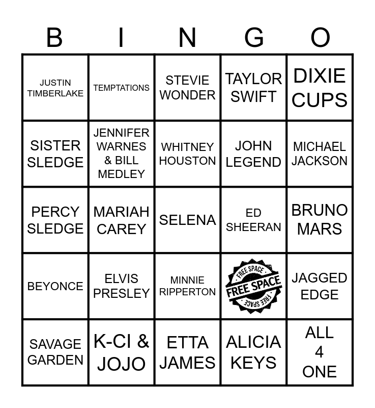 This bingo card has 1 images and 24 words: ELVIS PRESLEY, ETTA JAMES, WHITNEY HOUSTON, SAVAGE GARDEN, DIXIE CUPS, JUSTIN TIMBERLAKE, SISTER SLEDGE, TEMPTATIONS, ED SHEERAN, MINNIE RIPPERTON, JOHN LEGEND, PERCY SLEDGE, JAGGED EDGE, JENNIFER WARNES & BILL MEDLEY, ALL 4 ONE, BRUNO MARS, STEVIE WONDER, MICHAEL JACKSON, MARIAH CAREY, SELENA, K-CI & JOJO, BEYONCE, TAYLOR SWIFT and ALICIA KEYS.