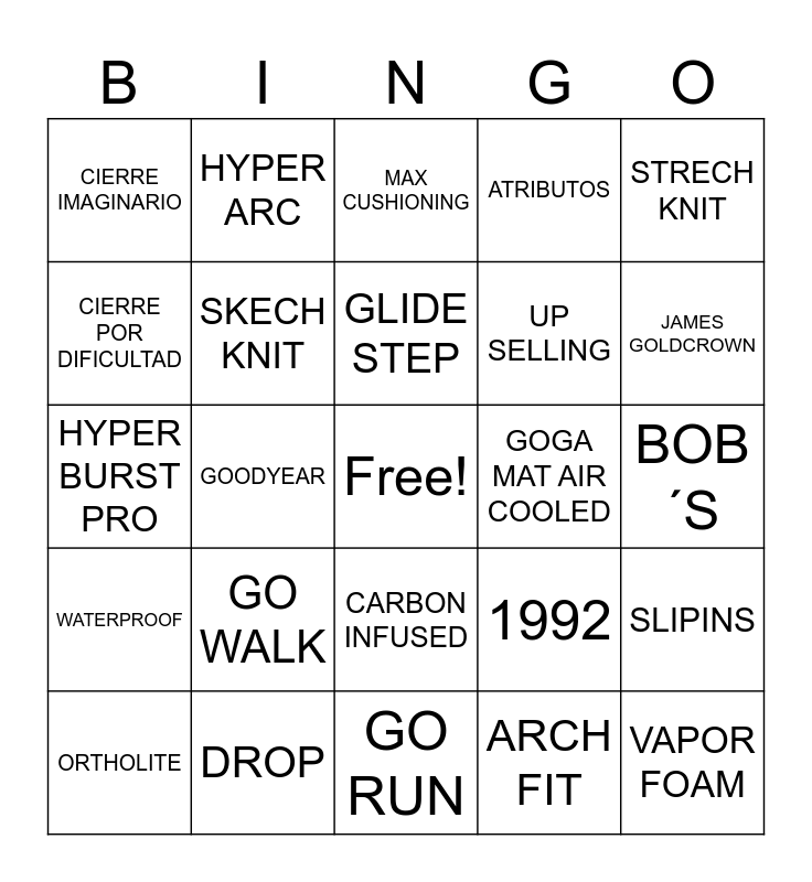 This bingo card has a free space and 32 words: ARCH FIT, HYPER BURST, GOODYEAR, MACHINE WASHABLE, WATERPROOF, SKECH KNIT, STRECH KNIT, SLIPINS, HYPER ARC, SKECH AIR, GLIDE STEP, MAX CUSHIONING, MEMORY FOAM CONFORT, MEMORY FOAM AIR COOLED, GOGA MAT AIR COOLED, M-STRIKE, ORTHOLITE, HYPER BURST PRO, CARBON INFUSED, GO WALK, 1992, D´LITES, BOB´S, DROP, VAPOR FOAM, ATRIBUTOS, UP SELLING, CIERRE POR DIFICULTAD, CIERRE IMAGINARIO, GO RUN, SNOOP DOGG and JAMES GOLDCROWN.