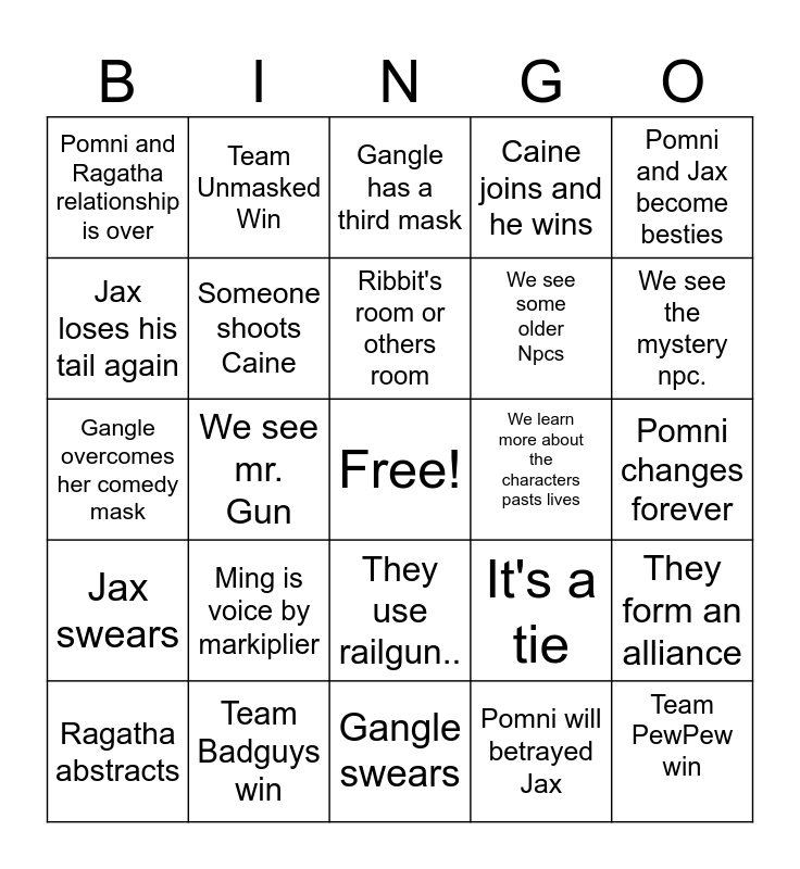 This bingo card has a free space and 24 words: Ming is voice by markiplier, Team Badguys win, Ribbit's room or others room, Ragatha abstracts, Pomni and Jax become besties, Pomni and Ragatha relationship is over, Jax loses his tail again, Team Unmasked Win, We learn more about the characters pasts lives, They use railgun.., We see some older Npcs, Gangle overcomes her comedy mask, It's a tie, They form an alliance, Someone shoots Caine, Pomni will betrayed Jax, Pomni changes forever, Gangle has a third mask, We see the mystery npc., We see mr. Gun, Team PewPew win, Jax swears, Caine joins and he wins and Gangle swears.