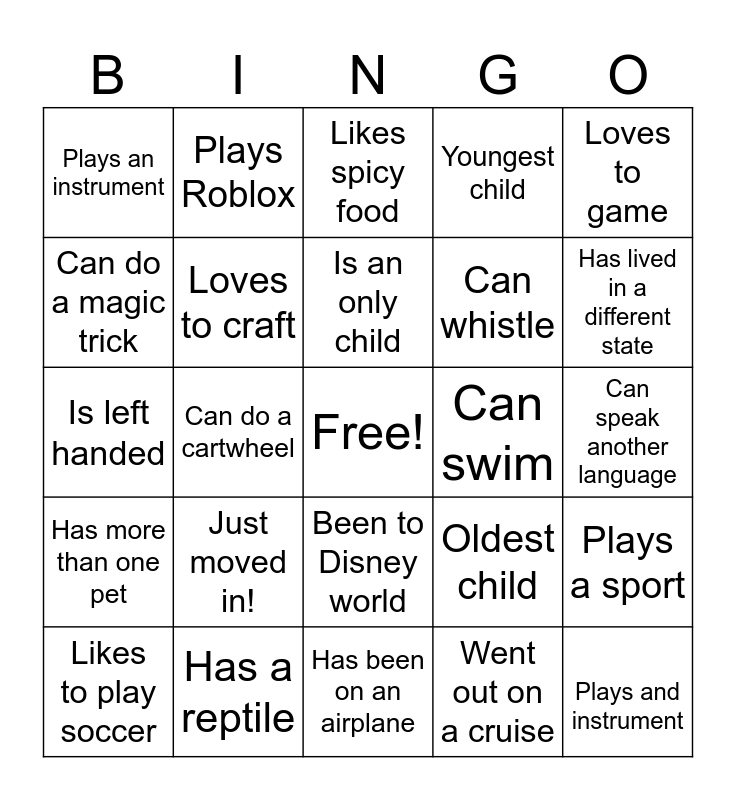 This bingo card has a free space and 24 words: Just moved in!, Has a reptile, Is an only child, Likes to play soccer, Loves to game, Plays an instrument, Can do a magic trick, Plays Roblox, Can swim, Been to Disney world, Can whistle, Is left handed, Oldest child, Plays a sport, Loves to craft, Went out on a cruise, Can speak another language, Likes spicy food, Has lived in a different state, Can do a cartwheel, Plays and instrument, Has more than one pet, Youngest child and Has been on an airplane.