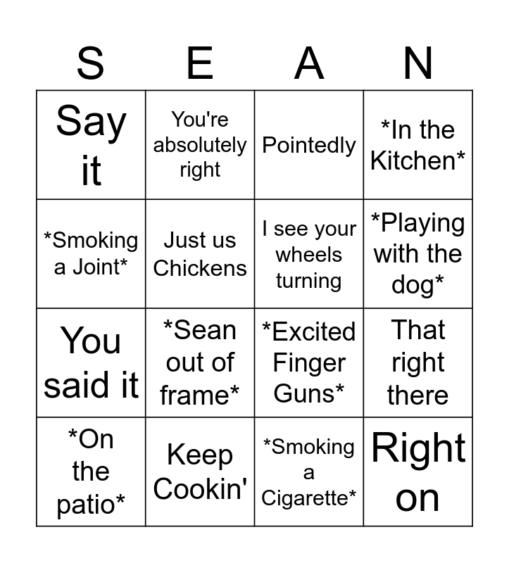 This bingo card has 16 words: Keep Cookin', That right there, Pointedly, Say it, You said it, You're absolutely right, *Excited Finger Guns*, *Smoking a Cigarette*, *Smoking a Joint*, Just us Chickens, *On the patio*, *In the Kitchen*, *Sean out of frame*, *Playing with the dog*, I see your wheels turning and Right on.