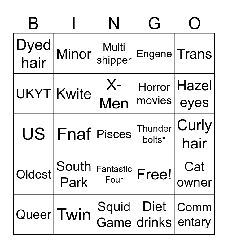 This bingo card has 25 words: South Park, Squid Game, X-Men, Queer, Trans, Dyed hair, UKYT, Minor, Thunder bolts*, Fantastic Four, Horror movies, US, Free!, Cat owner, Kwite, Comm entary, Curly hair, Multi shipper, Hazel eyes, Fnaf, Pisces, Twin, Oldest, Engene and Diet drinks.