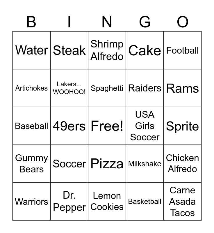 This bingo card has a free space and 24 words: Soccer, Dr. Pepper, Spaghetti, Warriors, Football, Water, Artichokes, Steak, USA Girls Soccer, Pizza, Raiders, Baseball, Milkshake, Chicken Alfredo, Lakers... WOOHOO!, Basketball, Sprite, Shrimp Alfredo, Rams, 49ers, Carne Asada Tacos, Gummy Bears, Cake and Lemon Cookies.