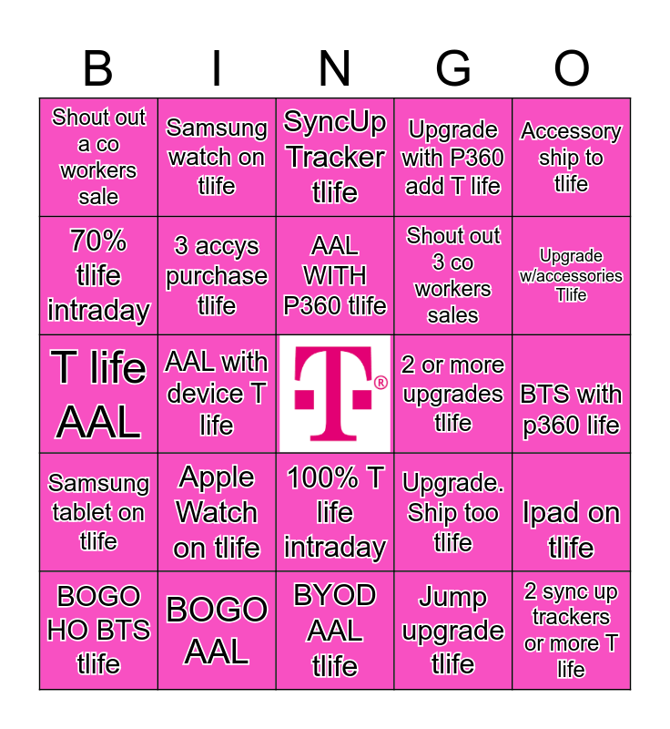 This bingo card has a free space and 24 words: Apple Watch on tlife, BOGO AAL, AAL WITH P360 tlife, BOGO HO BTS tlife, Accessory ship to tlife, Shout out a co workers sale, 70% tlife intraday, Samsung watch on tlife, 2 or more upgrades tlife, 100% T life intraday, Shout out 3 co workers sales, T life AAL, Upgrade. Ship too tlife, Ipad on tlife, 3 accys purchase tlife, Jump upgrade tlife, BTS with p360 life, SyncUp Tracker tlife, Upgrade w/accessories Tlife, AAL with device T life, 2 sync up trackers or more T life, Samsung tablet on tlife, Upgrade with P360 add T life and BYOD AAL tlife.