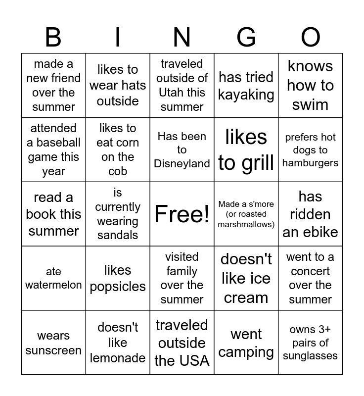 This bingo card has a free space and 34 words: currently has a sunburn, went camping, attended a graduation, went to the beach, ate watermelon, likes to eat corn on the cob, knows how to swim, wears sunscreen, likes to wear hats outside, owns 3 or more pairs of sandals, Has been to Disneyland, traveled outside of Utah this summer, is currently wearing shorts, watched fireworks on July 4th, Made a s'more (or roasted marshmallows), prefers hot dogs to hamburgers, doesn't like lemonade, read a book this summer, likes popsicles, doesn't like ice cream, visited family over the summer, always has the fan on, made a new friend over the summer, has ridden an ebike, traveled outside the USA, owns 3+ pairs of sunglasses, has tried kayaking, has been fishing, likes to grill, attended a baseball game this year, has never been to the ocean, is currently wearing sandals, went to a concert over the summer and learned a new skill or picked up a new hobby.