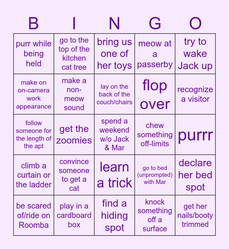 This bingo card has 34 words: sleep in the blanket basket, scratch furniture, sleep in the cat tree(s), make biscuits, purrr, purr while being held, get the zoomies, learn a trick, meow at a passerby, intently watch the outside world, make on on-camera work appearance, go to the top of the kitchen cat tree, find a hiding spot, knock something off a surface, recognize a visitor, follow someone for the length of the apt, play in a cardboard box, lay on the back of the couch/chairs, go to bed (unprompted) with Mar, declare her bed spot, be scared of/ride on Roomba, get stuck somewhere, bring us one of her toys, chew something off-limits, get her nails/booty trimmed, climb a curtain or the ladder, make a non-meow sound, watch tv with Mar, flop over, try to wake Jack up, drink from the fountain, convince someone to get a cat, spend a weekend w/o Jack & Mar and travel with Jack & Mar.