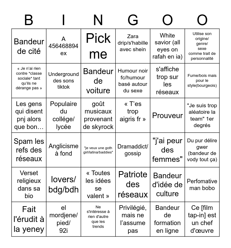 This bingo card has 36 words: Patriote des réseaux, « Toutes les idées se valent », Privilégié, mais ne l’assume pas, « Je n’ai rien contre *classe sociale* tant qu’ils ne dérange pas », Spam les refs des réseaux, « T’es trop aigris fr », Underground des sons tiktok, Ne s'intéresse à rien d'autre que les trends, White savior (all eyes on rafah en ia), Bandeur d'idée de culture, Fume/bois mais pour le style(bourgeois), Zara drip/s'habille avec shein, Perfomative man bobo, Populaire du collége/ lycée, Humour noir fc/humour basé autour du sexe, Bandeur de cité, Verset religieux dans sa bio, Prouveur, Les gens qui disent pnj alors que bon…, Pick me, goût musicaux provenant de skyrock, Anglicisme à fond, Dramaddict/ gossip, "je veux une goth girl/latina/baddies", "j'ai peur des femmes", A 456468894 ex, s'affiche trop sur les réseaux, el mordjene/ pied/ 92i, Bandeur de voiture, Utilise son origine/ genre/ sexe comme trait de personnalité, Ce [film tap-in] est un chef d'œuvre, Fait l'érudit à la yeney, Du pur délire gwer (bandeur de vody tout ça), "Je suis trop aléatoire la team" 1er degrés, lovers/ bdg/bdh and Bandeur de formation en ligne.