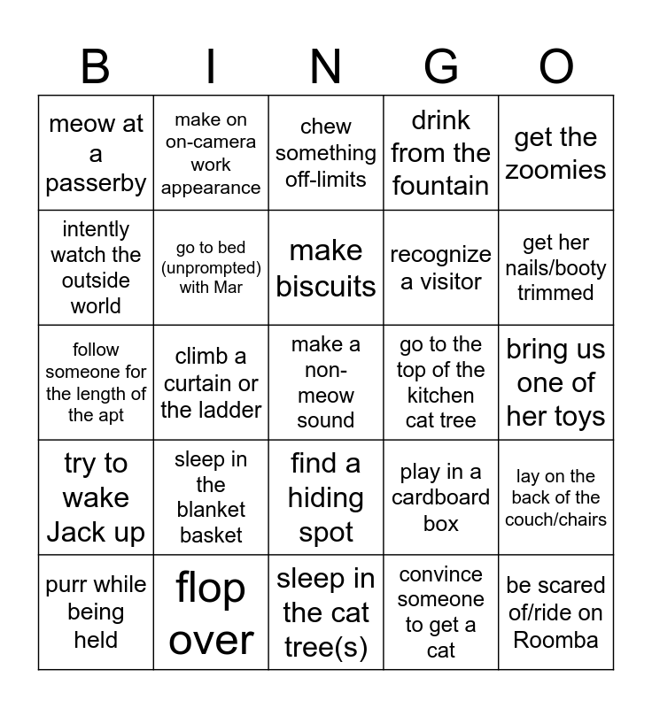 This bingo card has 25 words: sleep in the blanket basket, sleep in the cat tree(s), make biscuits, purr while being held, get the zoomies, meow at a passerby, intently watch the outside world, make on on-camera work appearance, go to the top of the kitchen cat tree, find a hiding spot, recognize a visitor, follow someone for the length of the apt, play in a cardboard box, lay on the back of the couch/chairs, go to bed (unprompted) with Mar, be scared of/ride on Roomba, bring us one of her toys, chew something off-limits, get her nails/booty trimmed, climb a curtain or the ladder, make a non-meow sound, flop over, try to wake Jack up, drink from the fountain and convince someone to get a cat.