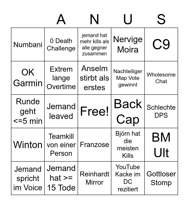 This bingo card has a free space and 49 words: Toxischer Chat, Gottloser Stomp, Tatsächlich Balanced Match, Reinhardt Mirror, Teamkill von einer Person, Neuer Held im Gegnerteam, 0 Death Challenge, Nico wird toxic, OK Garmin, Einer hat 0 Kills zu Rundenende, Extrem lange Overtime, Nervige Moira, BM Ult, Björn hat die meisten Kills, Solo Ult, Flashpoint, Anselm stirbt als erstes, Back Cap, Mike joint, C9, Jemand leaved, YouTube Kacke im DC rezitiert, Numbani, Nachteiliger Map Vote gewinnt, Gegner tea baggt, Wholesome Chat, Jemand spricht im Voice, Funny Text Interaction, Franzose, Winton, POTG mit <=1 Kills, Jemand von uns hat POTG, Wasted Ult, Wir stompen, Jemand hat >= 15 Tode, Aatlis gewinnt Map Vote, Deutscher Gamertag in lobby, Duo Im Team, Schlechte DPS, Support hat meiste Kills, Tank hat die meisten Tode, Jemand hat 3+ Environmental Kills, Suizid, Schlechtes Matchmaking, Runde geht <=5 min, jemand hat mehr kills als alle gegner zusammen, Lucio Boop Kill, Random Hanzo HS and AFK Teammate.