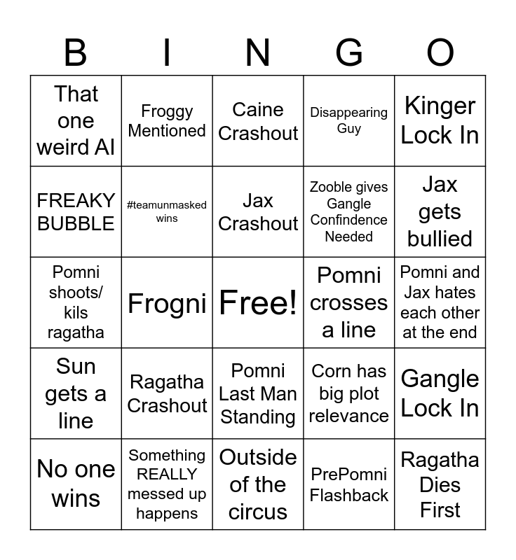 This bingo card has a free space and 24 words: Ragatha Crashout, Something REALLY messed up happens, Jax Crashout, No one wins, Kinger Lock In, That one weird AI, FREAKY BUBBLE, Froggy Mentioned, Pomni crosses a line, Pomni Last Man Standing, Zooble gives Gangle Confindence Needed, Pomni shoots/ kils ragatha, Corn has big plot relevance, Gangle Lock In, #teamunmasked wins, PrePomni Flashback, Pomni and Jax hates each other at the end, Caine Crashout, Jax gets bullied, Frogni, Ragatha Dies First, Sun gets a line, Disappearing Guy and Outside of the circus.