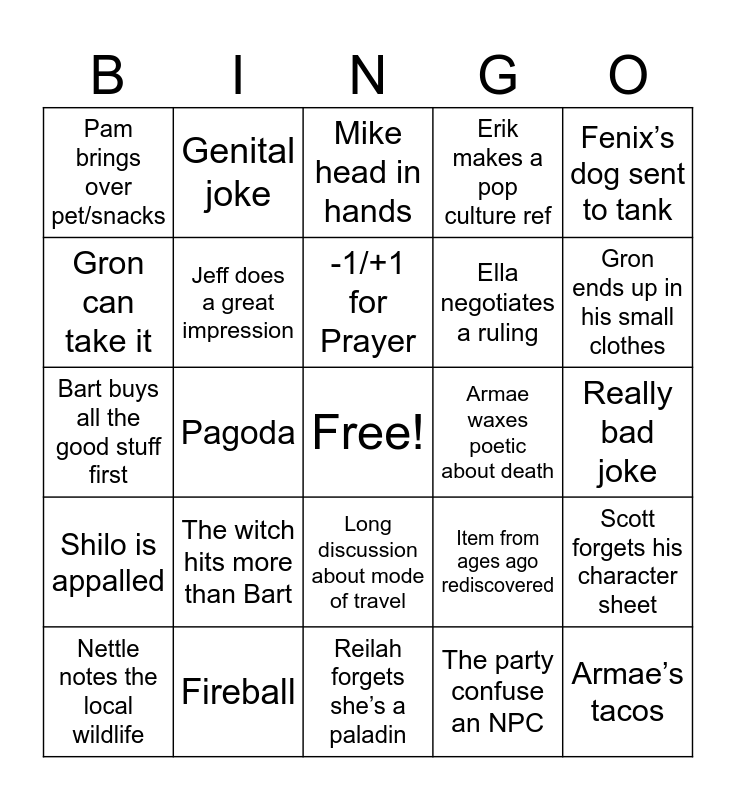 This bingo card has a free space and 24 words: The witch hits more than Bart, Fireball, -1/+1 for Prayer, Nettle notes the local wildlife, Fenix’s dog sent to tank, Pam brings over pet/snacks, Gron can take it, Genital joke, Armae waxes poetic about death, Long discussion about mode of travel, Ella negotiates a ruling, Bart buys all the good stuff first, Item from ages ago rediscovered, Scott forgets his character sheet, Jeff does a great impression, The party confuse an NPC, Really bad joke, Mike head in hands, Gron ends up in his small clothes, Pagoda, Armae’s tacos, Shilo is appalled, Erik makes a pop culture ref and Reilah forgets she’s a paladin.
