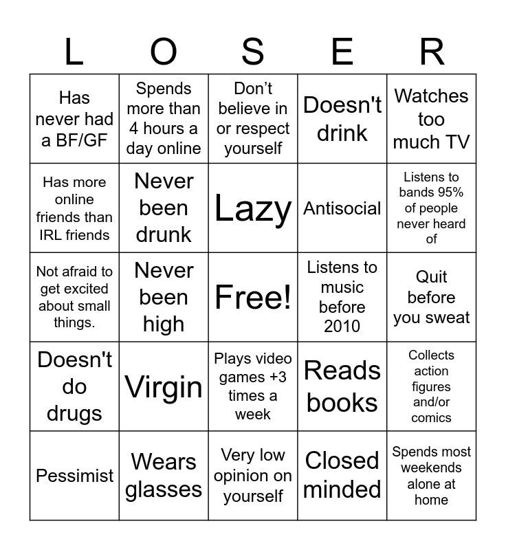 This bingo card has a free space and 24 words: Virgin, Wears glasses, Lazy, Pessimist, Watches too much TV, Has never had a BF/GF, Has more online friends than IRL friends, Spends more than 4 hours a day online, Listens to music before 2010, Plays video games +3 times a week, Antisocial, Not afraid to get excited about small things., Reads books, Collects action figures and/or comics, Never been drunk, Closed minded, Quit before you sweat, Don’t believe in or respect yourself, Listens to bands 95% of people never heard of, Never been high, Spends most weekends alone at home, Doesn't do drugs, Doesn't drink and Very low opinion on yourself.