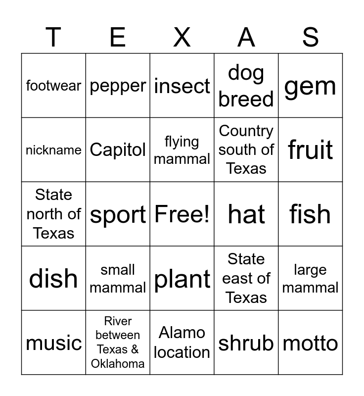 This bingo card has a free space and 37 words: flower, grass, bird, Capitol, large mammal, small mammal, flying mammal, seashell, gem, tree, sport, dog breed, motto, fish, nickname, dish, musical instrument, insect, plant, hat, footwear, fruit, music, Alamo location, reptile, shrub, pepper, colors in Texas flag, County we live in, city WMS is located, River between Texas & Mexico, River between Texas & Oklahoma, State north of Texas, State west of Texas, State east of Texas, Country south of Texas and color of star on Texas flag.