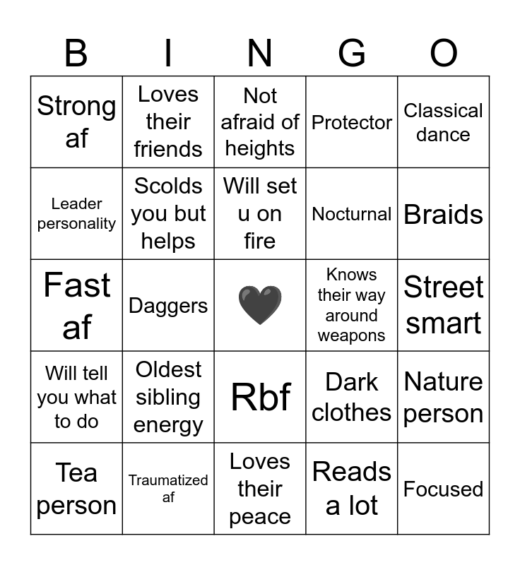 This bingo card has a free space and 24 words: Oldest sibling energy, Traumatized af, Will set u on fire, Tea person, Classical dance, Strong af, Leader personality, Loves their friends, Knows their way around weapons, Rbf, Nocturnal, Fast af, Dark clothes, Nature person, Scolds you but helps, Reads a lot, Street smart, Not afraid of heights, Braids, Daggers, Focused, Will tell you what to do, Protector and Loves their peace.