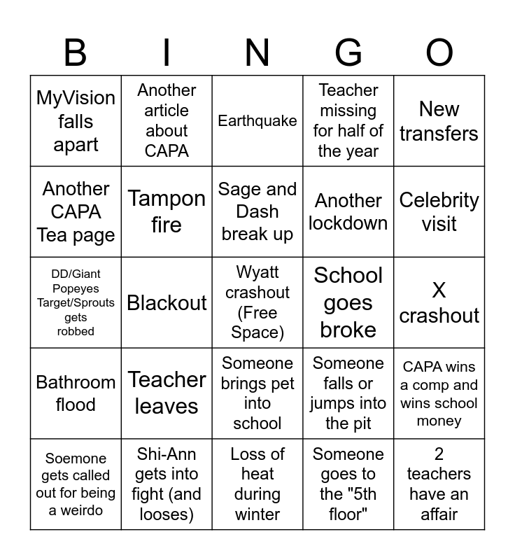 This bingo card has a free space and 24 words: Teacher leaves, Shi-Ann gets into fight (and looses), Sage and Dash break up, Soemone gets called out for being a weirdo, New transfers, MyVision falls apart, Another CAPA Tea page, Another article about CAPA, School goes broke, Someone brings pet into school, Another lockdown, DD/Giant Popeyes Target/Sprouts gets robbed, Someone falls or jumps into the pit, CAPA wins a comp and wins school money, Tampon fire, Someone goes to the "5th floor", X crashout, Earthquake, Celebrity visit, Blackout, 2 teachers have an affair, Bathroom flood, Teacher missing for half of the year and Loss of heat during winter.