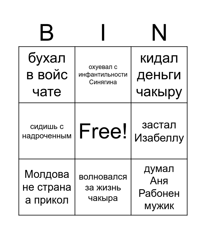 This bingo card has a free space and 8 words: застал Изабеллу, кидал деньги чакыру, охуевал с инфантильности Синягина, Молдова не страна а прикол, бухал в войс чате, думал Аня Рабонен мужик, сидишь с надроченным and волновался за жизнь чакыра.
