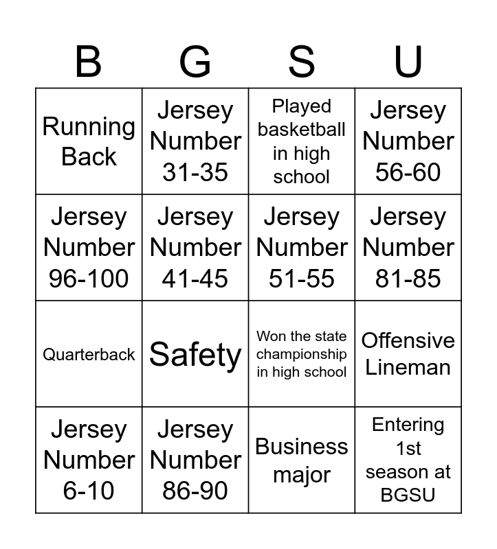 This bingo card has 49 words: Jersey Number 0-5, Jersey Number 6-10, Jersey Number 11-15, Jersey Number 16-20, Jersey Number 21-25, Jersey Number 26-30, Jersey Number 31-35, Jersey Number 36-40, Jersey Number 41-45, Jersey Number 46-50, Jersey Number 51-55, Jersey Number 56-60, Jersey Number 61-65, Jersey Number 66-70, Jersey Number 71-75, Jersey Number 75-80, Jersey Number 81-85, Jersey Number 86-90, Jersey Number 91-95, Jersey Number 96-100, Offensive Lineman, Defensive Lineman, Running Back, Quarterback, Tight End, Safety, Linebacker, Cornerback, Kicker/Punter, Entering 1st season at BGSU, Entering 2nd season at BGSU, Entering 3rd season at BGSU, Entering 4th season at BGSU, From Florida, From Georgia, From Texas, From Ohio, From Michigan, Business major, Communications major, Finance major, Marketing major, Pre-exercise science major, Sport management major, Won the state championship in high school, Played basketball in high school, Ran track in high school, Played baseball in high school and Enrolled in grad school.
